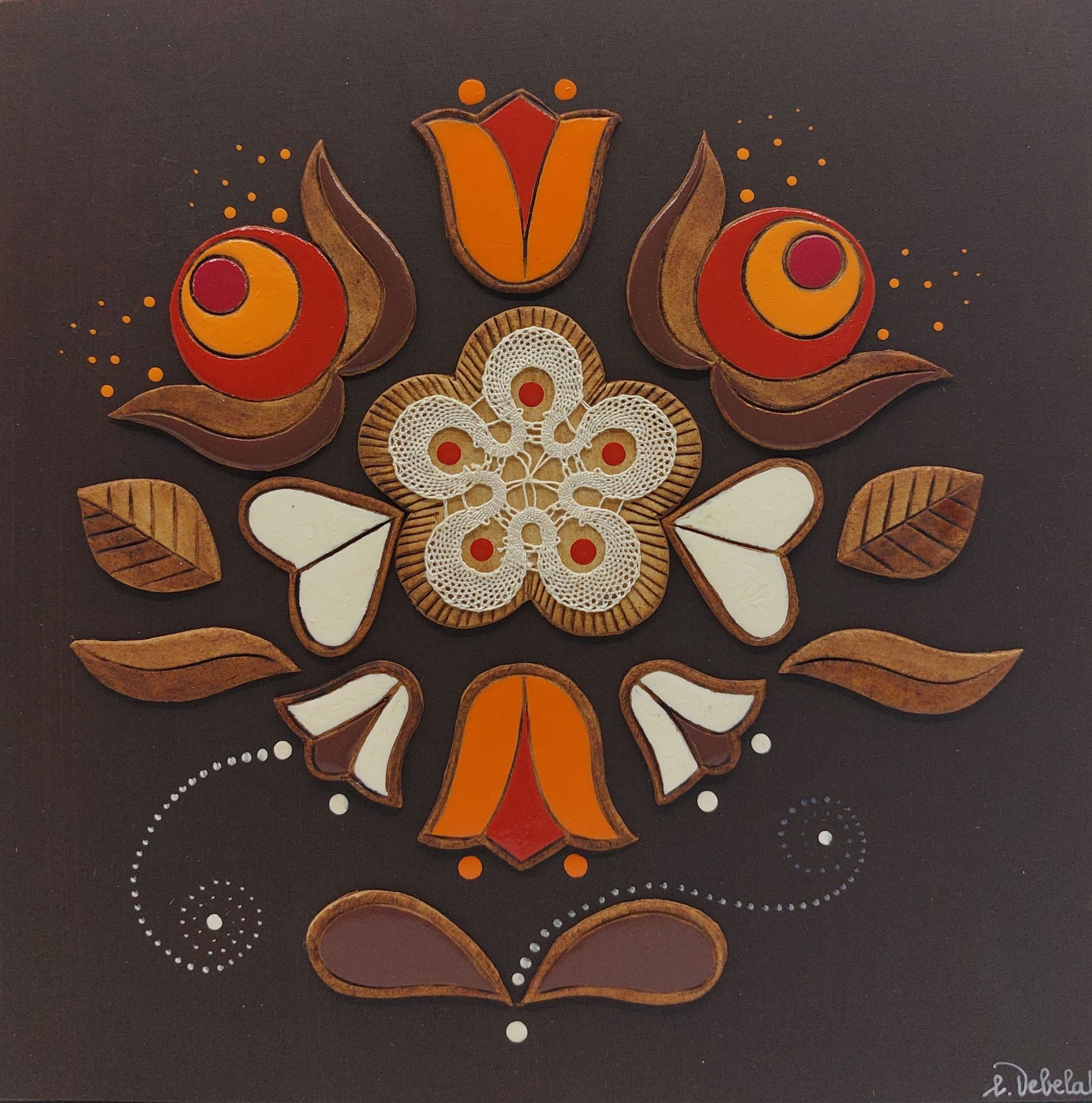 Stenski glineni relief s kombinirano čipko, podlaga je les.